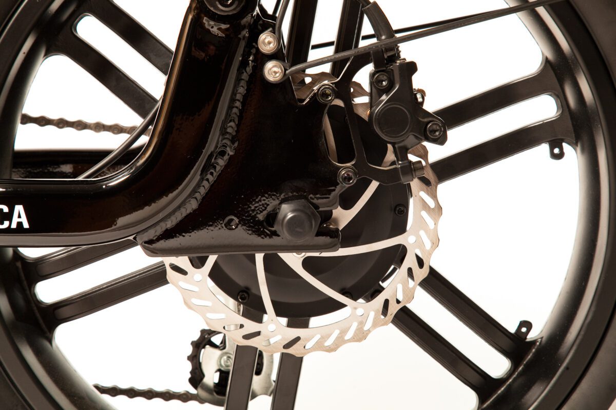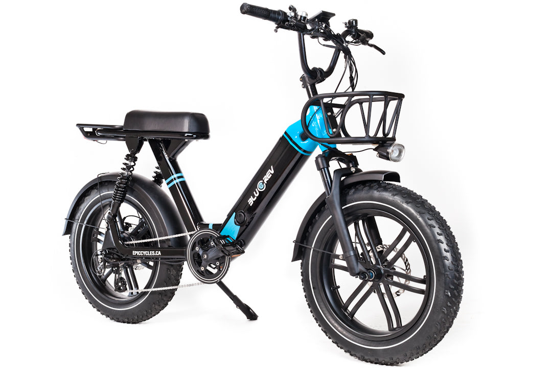 The BlueRev Miami Vice is a sleek looking moped style E-Bike equipped with a 48V 14Ah Samsung battery and 20 x 4 inches fat all terrain tires. Good for all year round! Equipped with a powerful 750W motor and Dual Suspension on puncture-resistant fat tires with a Hydraulic disc braking system this bike will provide incredible braking performance, power and stability.